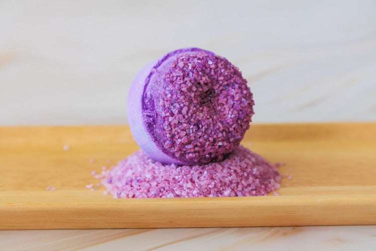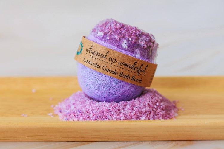 Our Lavender Druzy Bath Bombs are a customer favorite and crafted with the utmost care; a special cocoa butter blend is used for their dip, and each is finished with hand painted druzy stones made from spa salt and biodegradable glitter.