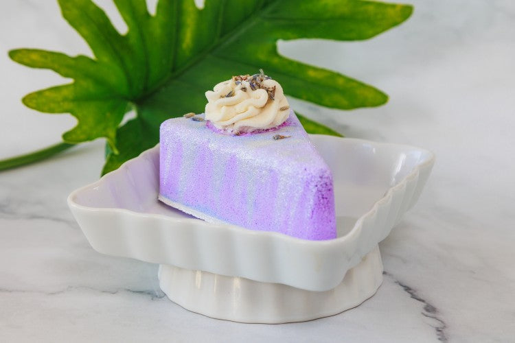 The Lavender Tea Butter Cake Bath Bomb boasts a carefully composed mixture of fresh lavender and invigorating green tea, plus shea butter, biodegradable shimmer paint, and sprinklings of shimmery lavender flowers. The "whipped cream" dollop is bubble based, which will offer a delightful bubble foam.